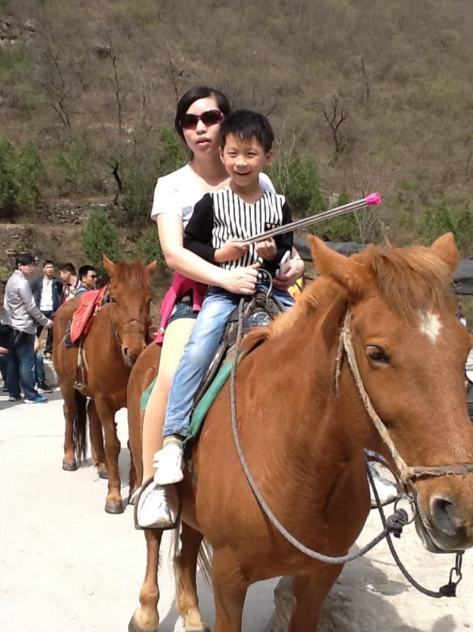 2014年5月6号,公司组织了一次短暂旅行,我带着儿子一起参加了十渡一日游。图为我们去十渡一线天的路途中,借助马的工具带我们走了小段的陡坡路,儿子更显兴奋。