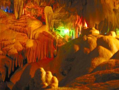 经过我们共同努力,走上了大厅的最高点,不知大家发现没有,我们的视野一下子就开阔了许多,那在99年的时候,一位地质专家到这儿,他发现,这个大厅的景观非常像我们的母亲河黄河沿岸风景的缩影。他说现在我们所站的位置非常像黄河的流经地黄土高原,而我们对面的景观像黄河的发源地现代冰川。去过黄土高原的人们就真地找到熟悉的感觉,不信大家看,这里有褐黄色的地表,陇起的丘埂,一层层梯田,就像等着农民来播种似的。